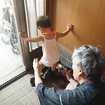 お外がのはらを呼んでいる! 出かけなきゃ! 福岡でも、お散歩だいすきのはらです。 ワンワンとばったり。 ちょっと緊張ののはら。 ワンワンが吠えると、固まってました。 みずがめの郷へ。 のどが渇くと、自分で水筒のふたを開けます。 お口で・・・。 お水がいちばん! 私が髪を切りに行く間、父におんぶしてもらいました。 機嫌良く笑うのはら。 40分後に帰宅したときには、ぐっすり寝てました。 旧ハングル教室の皆さん。 帰省のたびに会いに来てくださいます。 皆さん温かい雰囲気で、のはらは嬉しそうにまとわりついていました。 今回はアンパンマンのカバンをプレゼントに頂きました。 いつも、ありがとうございます♪ 階段は、昇るだけじゃない! 降りることもできるんだ! という事実に気がついたのはら。 おじいちゃんに手を握ってもらって、階段降り初体験! パパが来た! 親戚旅行に参加して、台風で滞在が延びたパパ..