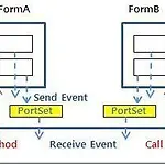 CCR 에서 WinForm들 간의 이벤트를 제어하는 방법을 알아보겠습니다. 우선 아래 그림과 같이 WinForm을 생성 한 후, 각각의 WinForm에서 발생하는 이벤트들을 중간의 CCR Program을 통해서 상호 중계해주는 예제를 알아보겠습니다. 그림1. 예제 다이어그램(출처: 네이버 MSRDS 카페) 메인 폼에서는 각각의 WinForm으로 부터 메세지를 받는 포트들을 정의해 놓고, 이러한 포트들에 메시지가 등록될 경우 실행되는 핸들러를 정의 합니다. 이 핸들러에서는 다시 각각 WinForm 들의 메소드를 호출하는 명령어를 기술해 놓아서 수신받은 다른 폼에 전달되도록 합니다. 즉, 별도의 WinForm으로 부터 데이터를 받을 때에는 포트를 통해서 받고, 이 포트에 연결된 핸들러안에서 FormInvok..